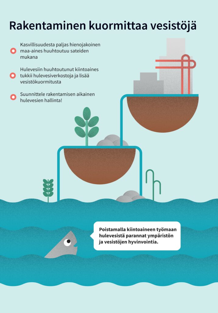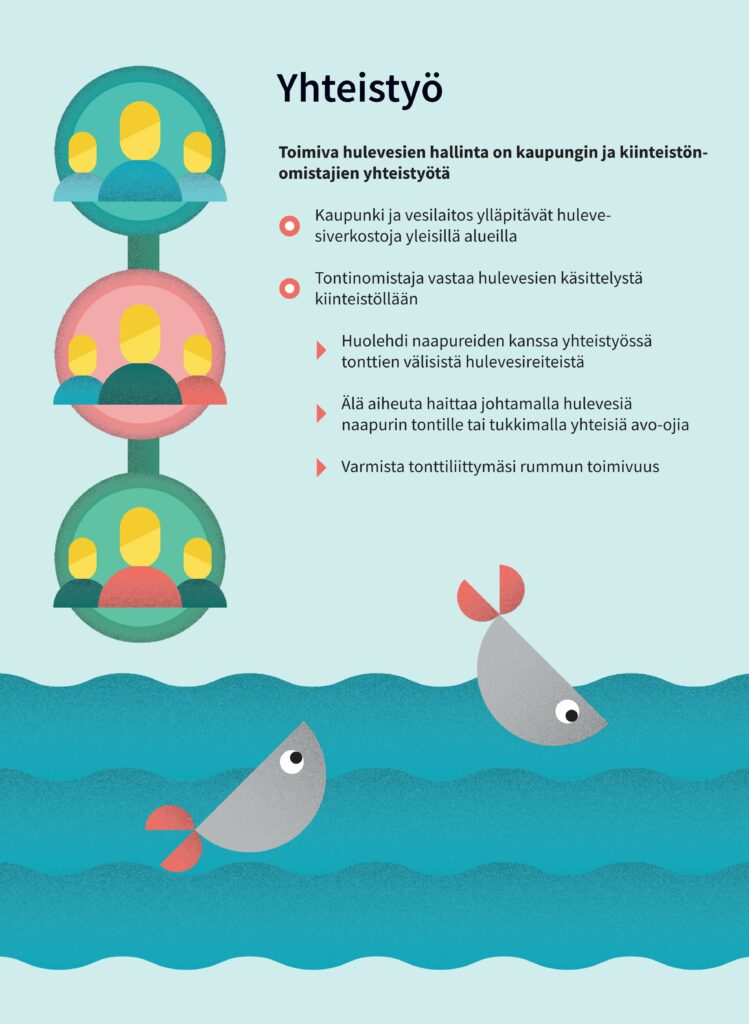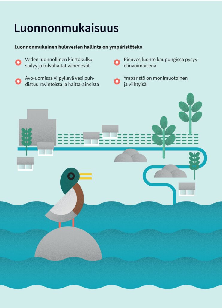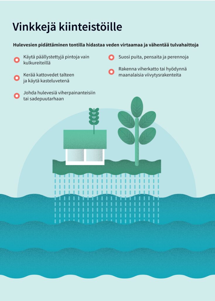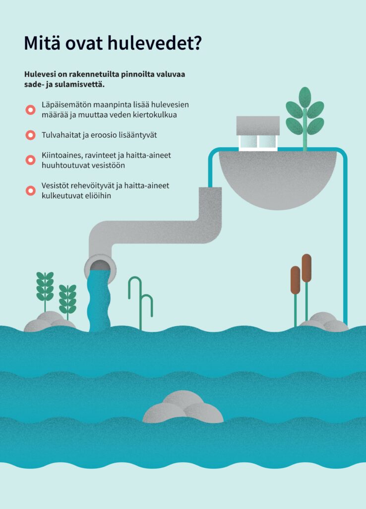 Mitä ovat hulevedet? Hulevesi on rakennetuilta pinnoilta valuvaa sade- ja sulamisvettä. Läpäisemätön maanpinta lisää hulevesien määrää ja muuttaa veden kiertokulkua, tulvahaitat ja eroosio lisääntyvät, kiintoaines, ravinteet ja haitta-aineet huuhtoutuvat vesistöön ja vesistöt rehevöityvät ja haitta-aineet kulkeutuvat eliöihin.Luonnomukaisten hulevesien hallinta on ympäristöteko. Veden luonnollinen kiertokulku säilyy ja tulvahaitat vähenevät, avo-uomissa viipyilevä vesi puhdistuu ravinteista ja haitta-aineista, pienvesiluonto kaupungissa pysyy elinvoimaisena ja ympäristö on monimuotoinen ja viihtyisä.Vinkkejä kiinteistöille. Hulevesien pidättäminen tontilla hidastaa veden virtaamaa ja vähentää tulvahaittoja. Käytä päällystettyjä pintoja vain kulkureitillä, kerää kattovedet talteen ja käytä kasteluvetenä, johda hulevesiä viherpainanteisiin tai sadepuutarhaan, suosi puita, pensaita ja perennoja ja rakenna viherkatto tai hyödynnä maanalaisia viivytysrakenteita.Yhteistyö on tärkeää. Toimiva hulevesihallinta on kaupungin ja kiinteistönomistajien yhteistyötä. Kaupunki ja vesilaitos ylläpitävät hulevesiverkostoja yleisillä alueilla, ja tontinomistaja vastaa hulevesien käsittelystä kiinteistöillään. Huolehdi naapureiden kanssa yhteistyössä tonttien välisistä hulevesireiteistä, älä aiheuta haittaa johtamalla hulevesiä naapurin tontille tai tukkimalla yhteisiä avo-ojia ja varmista tonttiliittymäsi rummun toimivuus.Rakentaminen kuormittaa vesistöjä. Kasvillisuudesta paljas hienojakoinen maa-aines huuhtoutuu sateiden mukana, hulevesiin huuhtoutunut kiintoaines tukkii hulevesiverkostoja ja lisää vesistökuormitusta. Suunnittele rakentamisen aikainen hulevesien hallinta! Poistamalla kiintoaineen työmaan hulevesistä parannat ympäristön ja vesistöjen hyvinvointia.Järvenpää, Keski-Uudenmaan ympäristökeskus, Vantaanjoen ja Helsingin seudun vesiensuojeluyhdistys ry.