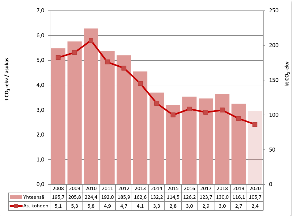 Järvenpään päästöt vähenevät, vaikka asukasmäärä kasvaa. Päästöt asukasta kohti olivat 2,7 t CO2-ekvivalenttia/asukas vuonna 2019 ja ennakkotiedon mukaan 2,4 t CO2-ekvivalenttia/asukas vuonna 2020.