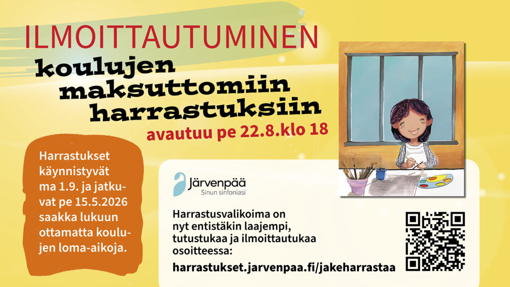 —Opetus ja kasvatusJärvenpään koulujen maksuttomat harrastukset käynnistyvät jälleen, ja harrastuskalenteri ensi lukuvuodelle on nyt julkaistu osoitteessa harrastukset.jarvenpaa.fi/jakeharrastaa.