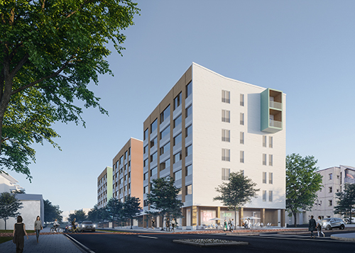 Järvenpään Myllytien-Valtuustokadun kortteli rakentuu puurakenteisena. Havainnekuva: Lehto Group Oyj.