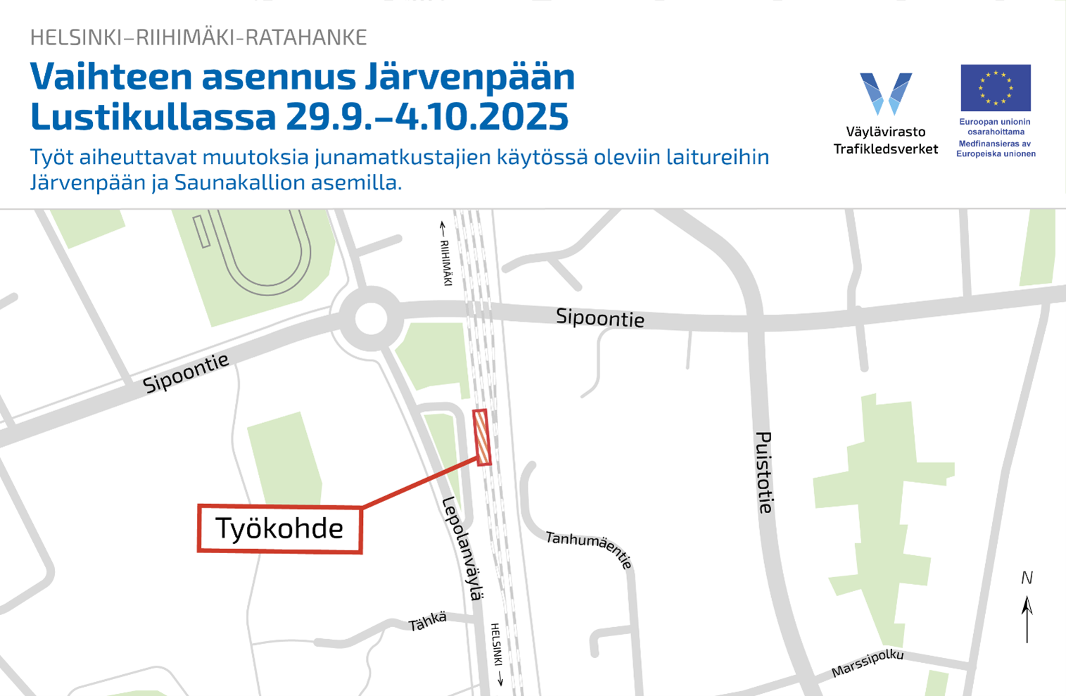 Hankkeella asennetaan uusi vaihde Järvenpään Lustikullassa 29.9.–4.10.2025. Vaihteen asentaminen edellyttää junaliikenteen tilapäistä keskeyttämistä yhdeltä raiteelta, mikä aiheuttaa muutoksia käytössä oleviin matkustajalaitureihin Järvenpään ja Saunakallion asemilla. Junat käyttävät 29.9.2025 klo 3.30 – 4.10.2025 klo 06.00 Järvenpäässä sekä Saunakalliossa laitureita 3 ja 4. Tänä aikana kummankin aseman laituri 1 on poissa käytöstä.