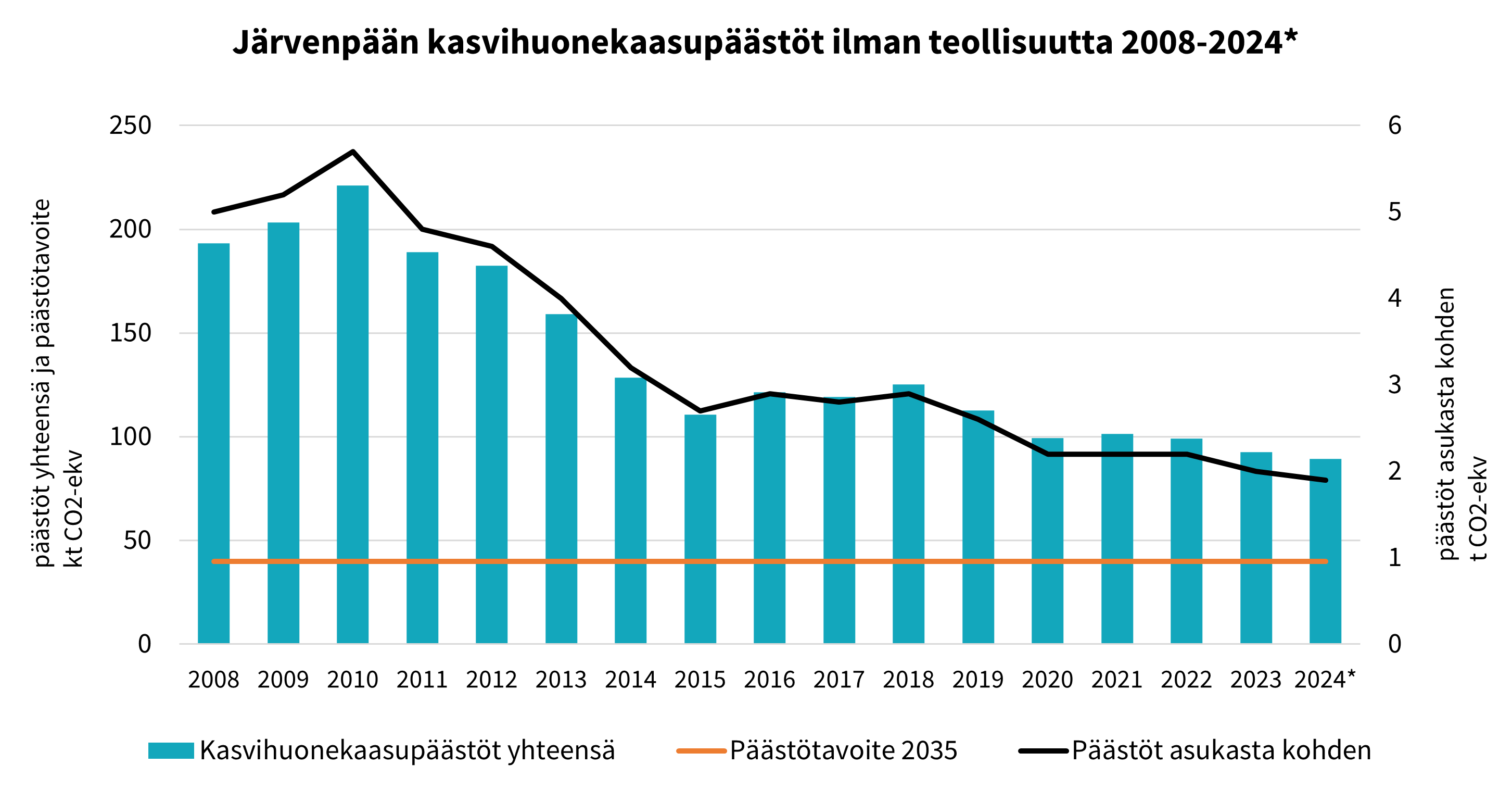 Vuonna 2023 Järvenpään kasvihuonekaasupäästöt ilman teollisuutta olivat yhteensä 92,5 kt CO2-ekvivalenttia ja vuonna 2024 ennakkotiedon mukaan 89,3 kt CO2-ekv. Päästöt ilman teollisuutta laskivat 7 % vuodesta 2022 vuoteen 2023 ja ennakkotiedon mukaan 3 % vuodesta 2023 vuoteen 2024. CO2-raportointiin osallistuvien kuntien päästöt laskivat keskimäärin 9 % vuodesta 2022 vuoteen 2023.