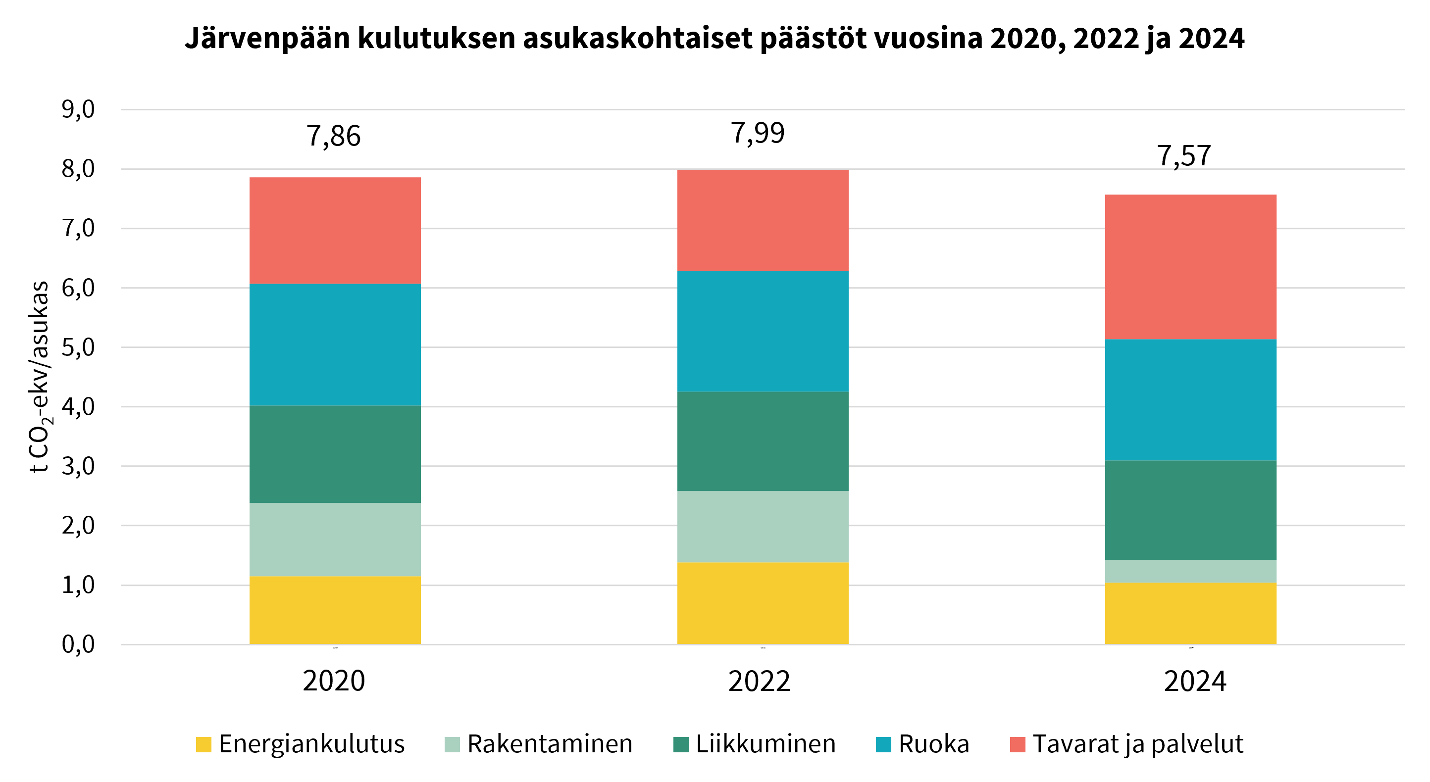 Kulma-hankkeen laskennassa kulutuksen päästöjä tarkastellaan energiankulutuksen ja rakentamisen, liikkumisen, ruuan sekä tavaroiden ja palveluiden osalta. Järvenpään kulutuksen kasvihuonekaasupäästöt olivat vuonna 2024 yhteensä 7,57 t CO2-ekv asukasta kohden. Vuonna 2022 kulutuksen asukaskohtaiset Järvenpäässä olivat 7,99 t CO2-ekv ja vuonna 2020 7,86 t CO2-ekv. Kaikkien laskentaan osallistuneiden kuntien asukaskohtaiset päästöt vaihtelivat 7,1 ja 9,9 t CO2-ekv välillä vuonna 2024.
